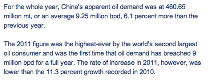 …In 2011, was up, but apparently slowing down. The Chinese are using about 9.6 mbd, about half of the American total.