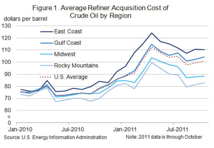 Filed under: Uncategorized | Tags: Brent, crude oil prices, Cushing, EIA, feedstock, refineries, refinery, refinery acquisition costs, This Week in Petroleum, US refineries, WTI