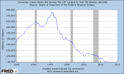 Filed under: Uncategorized | Tags: business, consumer loans, FRED, graph, not too big to fail, small banks, St. Louis Fed